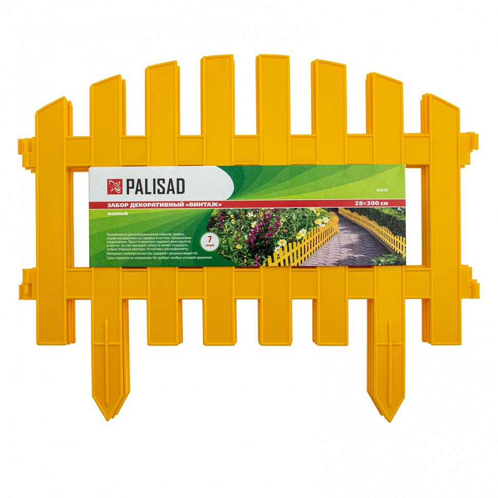 Желтый декоративный забор размером 28 х 300 см, предназначен для зонирования территории. Состоит из 7 оригинальных секций общей длиной 300 см. С их помощью можно оформить клумбу, дорожку или зону отдыха, огородить грядки, деревья или кусты. Забор придаст законченный вид территории дачного участка.Преимущества: - Долговечность — забор изготовлен из прочного полипропилена, устойчивого к воздействию ультрафиолета, влаги и перепадов температур.