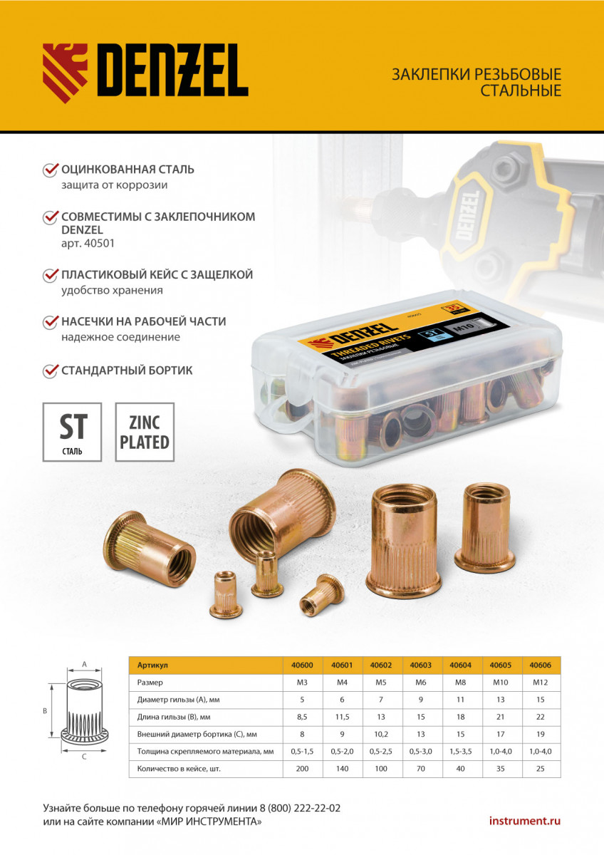 Стальные резьбовые заклепки Denzel 40603, с резьбой M6, оцинкованные, предназначены для скрепления листовых материалов толщиной 0,5-3 мм. Совместимы с заклепочником Denzel 40501. Позволяют получить резьбовое соединение даже при одностороннем доступе к месту крепления. Крепежные элементы используются для проведения строительных и монтажных работ, пригодятся на даче и в гараже.