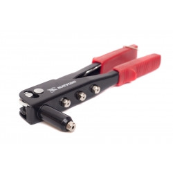 Рабочие части инструмента изготовлены из конструкционной стали. В комплект заклепочника входят четыре насадки под разные диаметры заклепок и ключ для их замены. Предназначен для установки алюминиевых заклепок при скреплении заготовок и деталей.