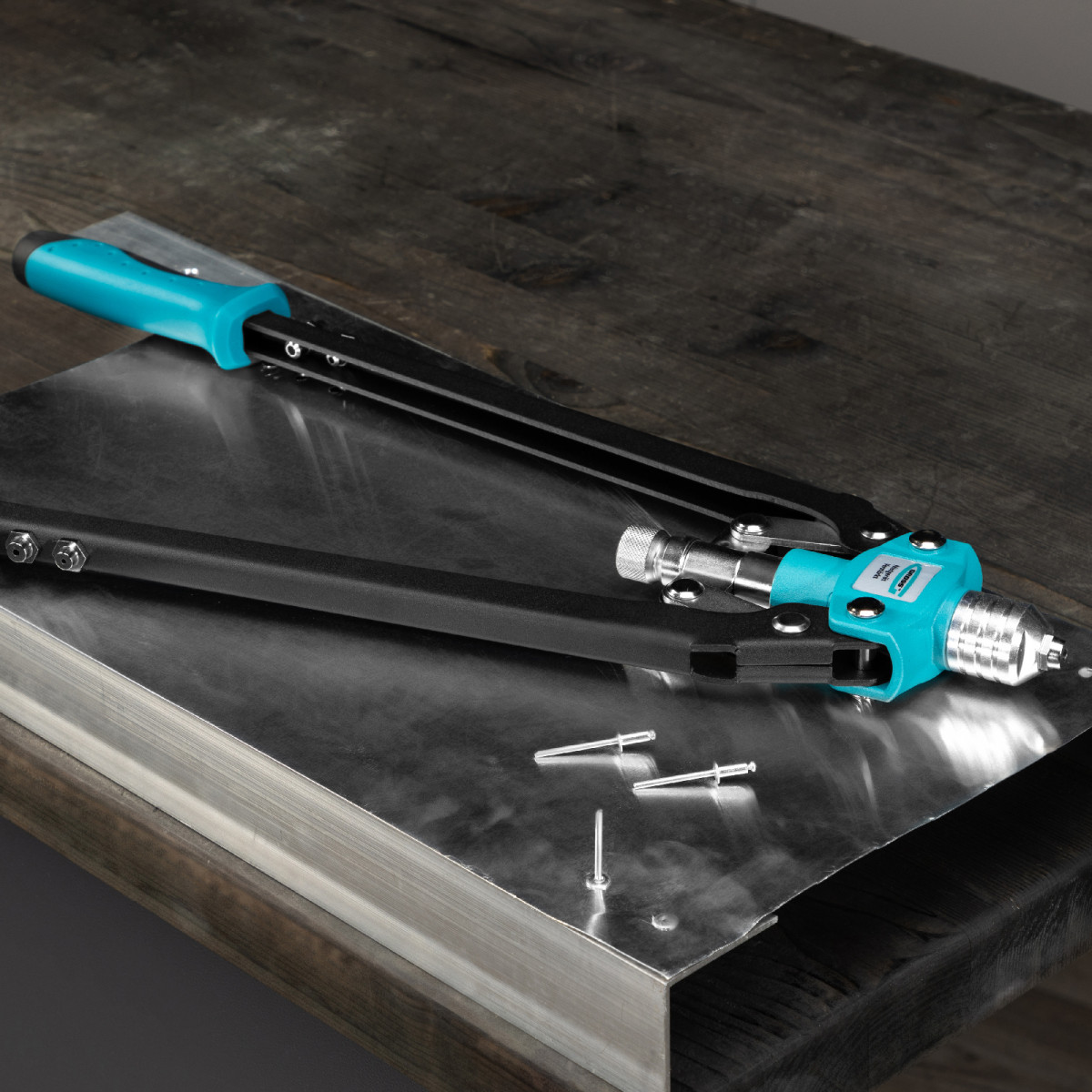 Двуручный усиленный заклепочник Gross 40409 длиной 520 мм, с удлиненными рукоятками, предназначен для соединения листовых заготовок, металлопрофиля, легких строительных конструкций и плоских деталей при помощи алюминиевых или стальных (в том числе из нержавеющей стали) заклепок размером 3,2-4,0-4,8-6,0-6,4 мм, для которых предусмотрены сменные насадки соответствующих размеров. Благодаря удлиненным рукояткам процесс клепки требует меньше усилий, чем при применении обычного инструмента. Заклепочник используется при проведении строительных и ремонтных работ, в производстве мебели, бытовой и оргтехники, а также при ремонте автомобилей.
