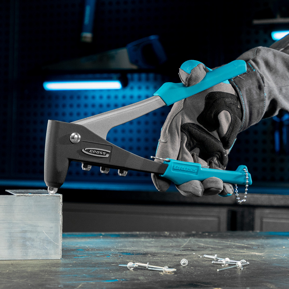 Литой заклепочник Gross 40401 надежно соединяет листовые заготовки при помощи алюминиевых и стальных заклепок размером от 2,4 до 4,8 мм, а также заклепок из нержавеющей стали диаметром 2,4-3,2 мм. В комплекте имеются сменные головки соответствующих размеров. Неиспользуемые насадки располагаются в корпусе инструмента, а значит, не придется тратить время на их поиск. Заклепочник рекомендован для профессионального применения, а также может быть полезен в быту.