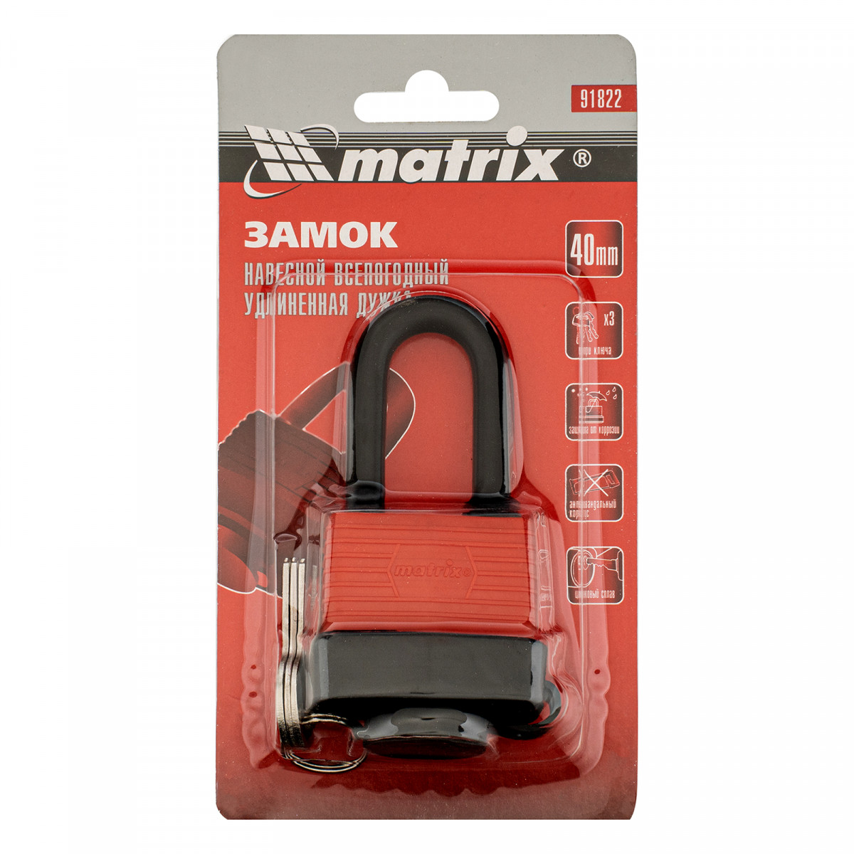 Навесной всепогодный замок Matrix 91822 шириной 40 мм, с удлиненной дужкой, вешается на дверь и обеспечивает сохранность имущества. Поможет защитить от несанкционированного проникновения сарай, гараж, подвал и другие помещения, подходит для высоких запорных петель.