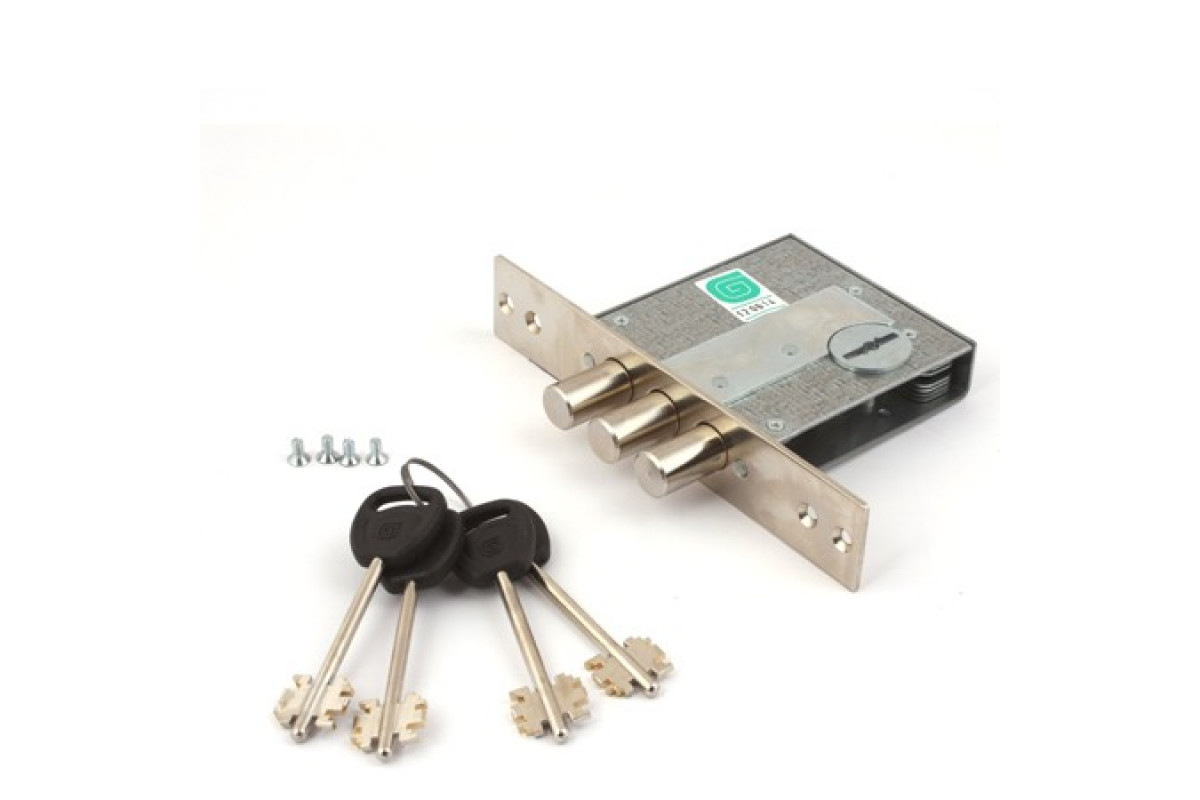 Замок врезной 8-сувальдный с бронепластиной, надежно защищающей от высверливания. . Предназначен для установки в металлические двери, шкафы и сейфы. Три цилиндрических ригеля.Стальная торцевая планка, покрытие - никель, ширина планки 30мм. 4ключа.