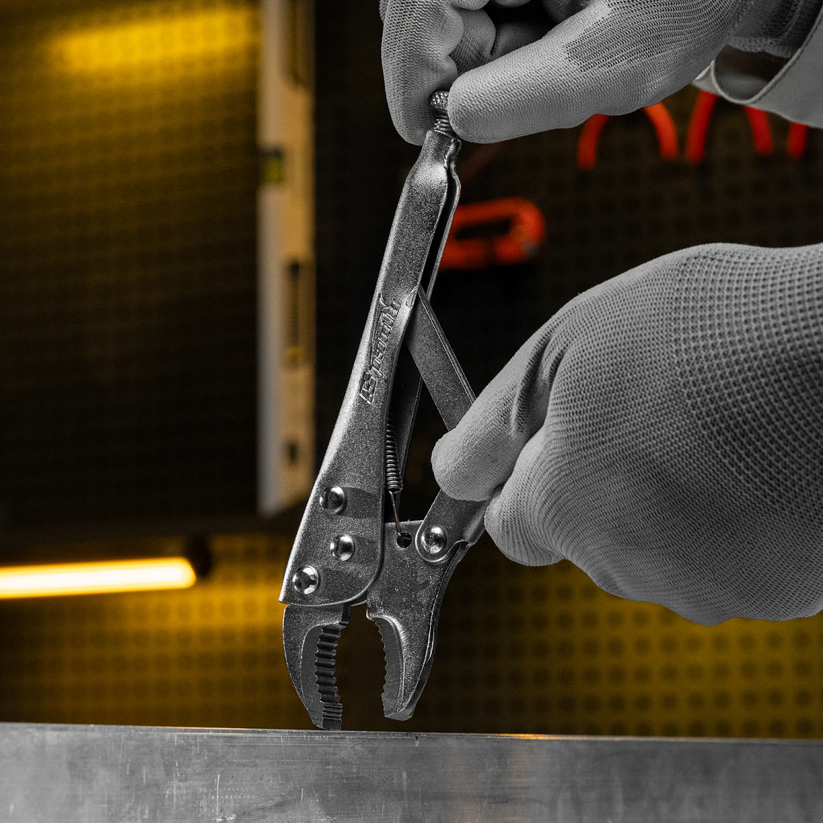 Ручной зажим Sparta 184205 длиной 180 мм, с полукруглым захватом, позволяет фиксировать детали разной формы для последующей сварки, резки, шлифовки и других работ. Используется в слесарном деле, во время строительства и ремонта, для проведения кузовных работ, а также полезен в быту.